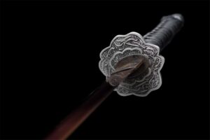 Beskyttelsen: Beskyttelsen på katanaen, kjent som tsubaen, er et sirkulært eller ovalt metallstykke som er plassert mellom bladet og håndtaket. Tsubaen bidrar til å beskytte hånden mot å skli på bladet under kamp.