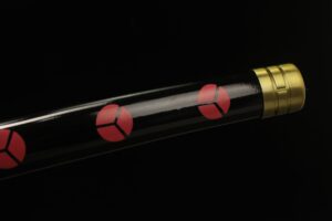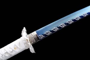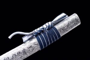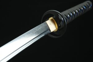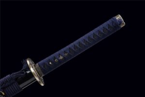 Langt håndtak: Håndtaket på katanaen, kjent som tsuka, er vanligvis mellom 25-30 centimeter langt og er omviklet med et materiale som silke eller lær. Håndtaket er utformet slik at det ligger godt i hånden og gir et sikkert grep under bruk.